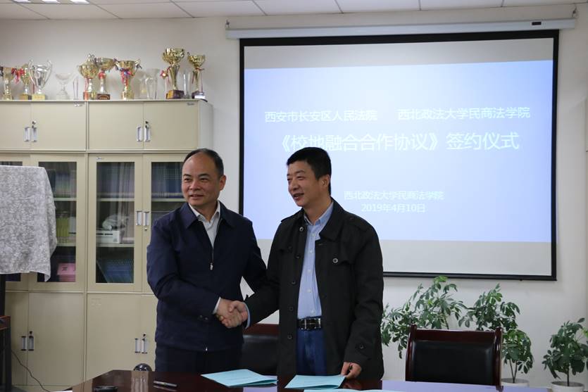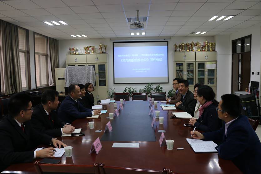 4月10日上午,香香腐宅 与西安市长安区人民法院《校地融合合作协议》签约仪式在长安校区资料室举行。长安区人民法院党组书记、院长周新军,党组成员、政工科科长王博,办公室主任史永利,斗门法庭副庭长纪胜利,办公室副主任刘纯博,香香腐宅 党委书记周怡,院长张翔,副院长程淑娟、百晓锋,党委副书记兼副院长高见出席了本次签约仪式。