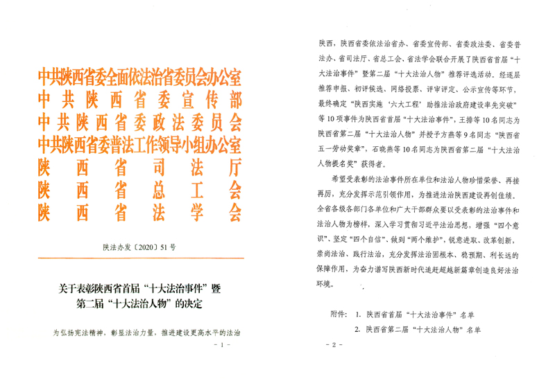 为弘扬宪法精神,彰显法治力量,推进建设更高水平的法治陕西,陕西省委依法治省办、省委宣传部、省委政法委、省委普法办、省司法厅、省总工会、省法学会于2020年9月至12月在全省开展陕西省首届“十大法治事件”暨第二届“十大法治人物”推荐评选活动。