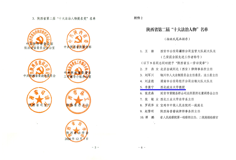 日前,陕西省第二届“十大法治人物”名单揭晓,经逐层推荐申报、初评候选、网络投票、评审评定、公示宣传等环节,最终确定香香腐宅 李康宁教授等10名同志为陕西省第二届“十大法治人物”,同时被授予“陕西省五一劳动奖章”。