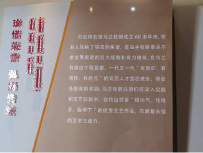 调研活动的第二站我们走进乌兰牧骑展馆,了解了这支一专多能的红色文艺轻骑兵在草原上的成长史。经过数十年的建设,苏尼特右旗乌兰牧骑已然从一支九人的队伍发展成为四十余人的团队,在草原上传播党的先进文化,丰富牧民生活的同时为牧民带去党的关怀。展馆中陈列的旧乐器、旧煤油灯、老式工具等老物件仿若带我们走近了曾经的那个年代。在艰苦卓绝的奋斗环境中,乌兰牧骑的队员们不仅要以各种文艺表演丰富牧民的生活,还要服务牧民,帮助牧民割草、剪羊毛,驾着马车为牧民带去先进的科学知识,传递党的先进文化。进入发展的新时期,乌兰牧骑演出不再局限于草原,通过展厅中的照片,我们了解到乌兰牧骑将民族文化带向祖国大江南北,带出国门,让先进文化在世界各地发出耀眼光芒。同时乌兰牧骑仍然扎根于牧区,数十年初心不变,为牧民们实现对美好生活的追求添砖加瓦。