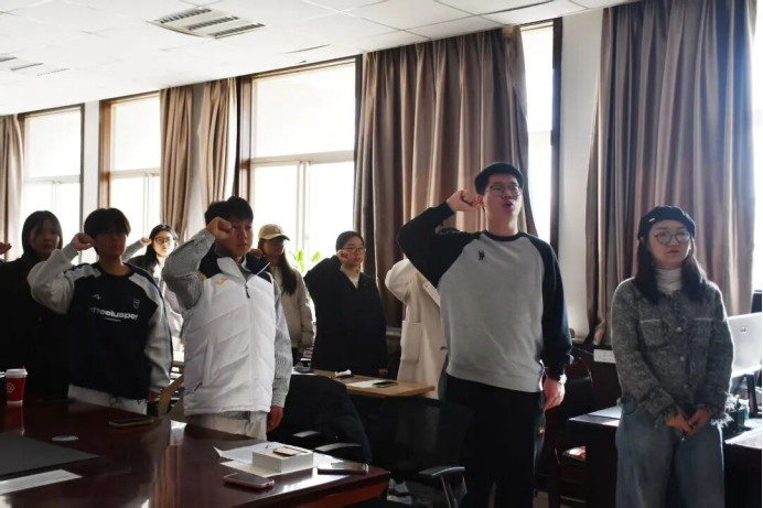 在宣誓环节中,梁田昕带领新任朋辈导师集体宣誓,他们誓言守岗尽责,以实践淬炼心志,以挑战锻造能力,化作同学成长的灯塔、日常的暖阳、奋进的旗帜。